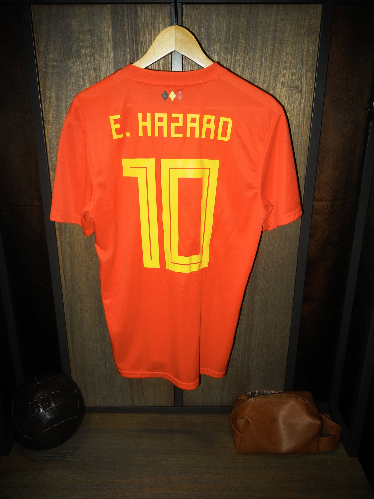 Crafted by Adidas, this jersey features the iconic red base with yellow diamond patterning inspired by Belgium’s 1984 design. Hazard’s name and number are printed in official tournament style, making it perfect for fans and collectors.