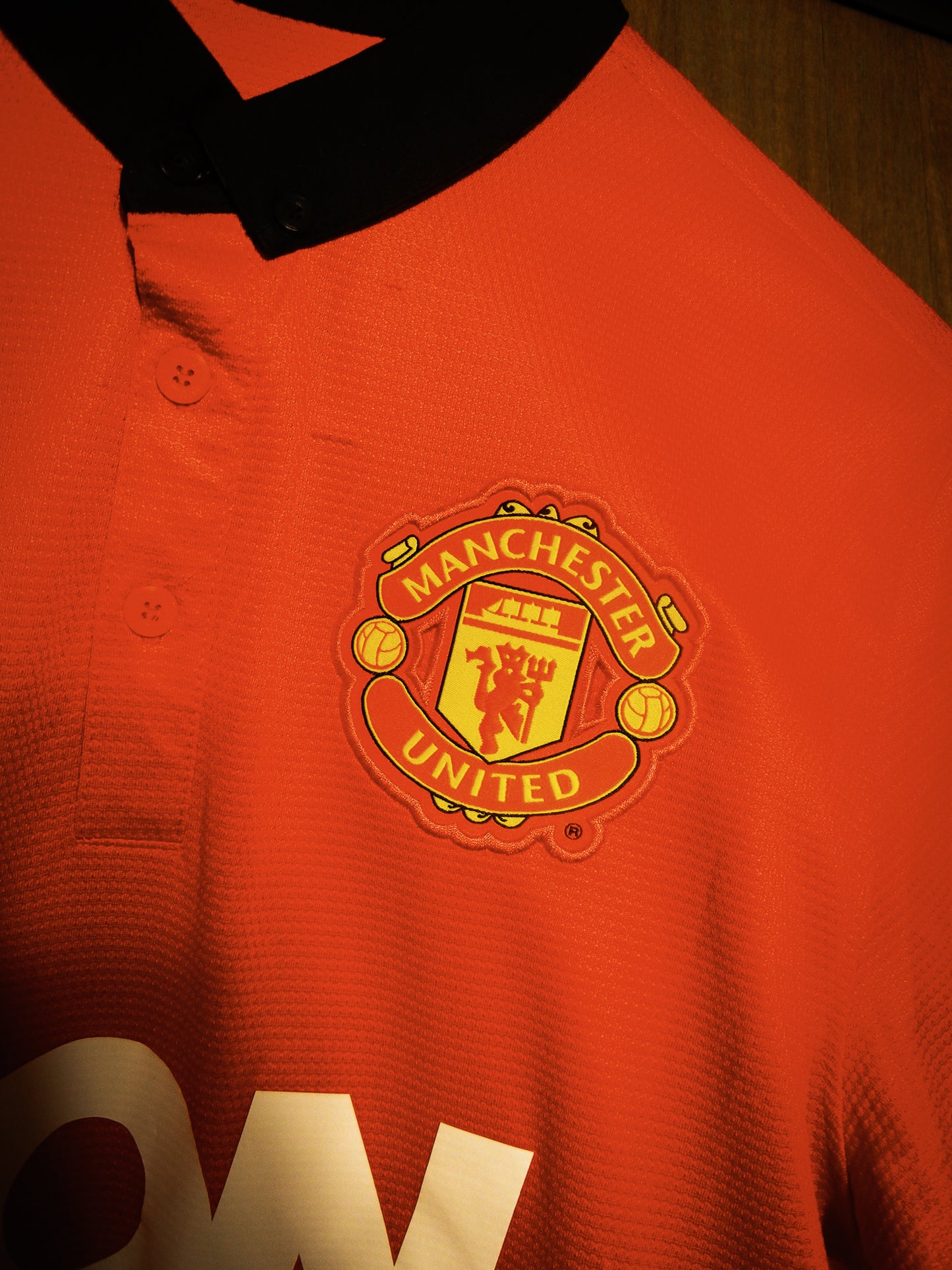 Made by Nike under MPN: 532837-624, the jersey features a striking red body with a traditional black button-down collar and white trim. The AON sponsor logo adorns the chest, while Van Persie’s name and number are printed on the back in the official Premier League font. Crafted from breathable Dri-FIT polyester, it combines comfort with style.